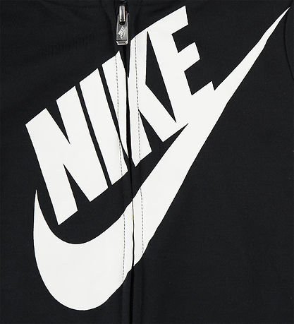 The Nike cardigan is black with a large white logo print on the front. It has a soft hood and a full-length zipper at the front. It has long sleeves with ribbed edges at the sleeve and waist opening.