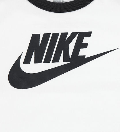 The Bodysuit is white with black edges and a large black logo print on the front. The Bodysuit has a round neckline with practical folded shoulders and short sleeves. It closes with push buttons between the legs.