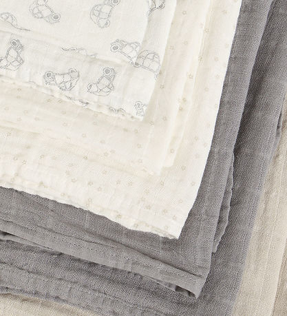 Practical Pippi Baby muslin cloths in a pack of eight. The Pippi Baby cloth diapers come in different colours and patterns: two in white with blue cars, two in off white with discreet star, two in grey, and two in beige.