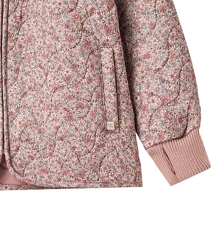 Beautiful Wheat thermo jacket in pink with an allover floral print in light blue, green, white and pink shades. The Thermo jacket has a wavy, quilted structure.