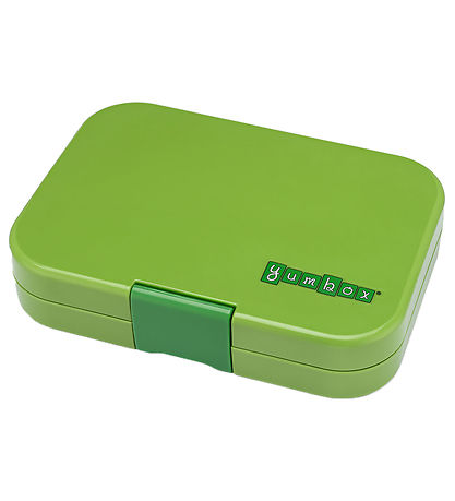 The Yumbox lunchbox has a square shape, and it has a fixed lid, which opens at the front with a clip. Inside, the lunchbox has a removable compartment divider with one large compartment, two smaller compartments and one little, round compartment for dipping or similar. In the lid, there is soft silicone, which closes tightly around the room divider.