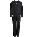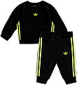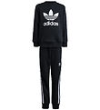 The adidas Originals sweatshirt has long sleeves and can be opened with push buttons on the right shoulder. There are ribbed edges at the neck, bottom and wrists. The sweatpants have a wide elastic edge waistband, which is adjusted with laces at the front. At the ankles, the trousers are held in place with a wide ribbed edge.