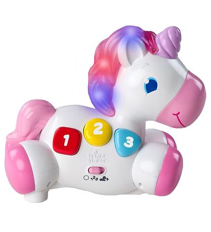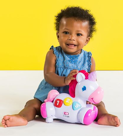 Adorable Bright Starts activity toy depicting a white unicorn with rose and pink details.