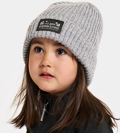 Lovely Didriksons beanie in grey melange, knitted rib quality with a black and white logo patch on the front.