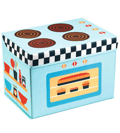 Beautiful Djeco storage box in blue and yellow shades and with the appearance of a toy kitchen.