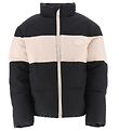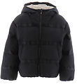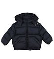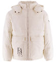 The Emporio Armani duvet jacket has a removable hood, which is Fast with a push buttons, and it closes in front of the chin with two push buttons. The sleeves have narrow elastic edges. The duvet jacket opens with a zipper with chin guard and inner wind pole, and on the front there are two open pockets with a fleece-lined flap pocket on the outside, which closes with velcro. The duvet jacket has a smooth woven lining and it has a warm polyester padding.