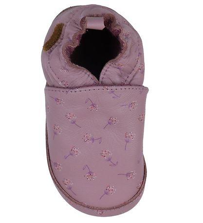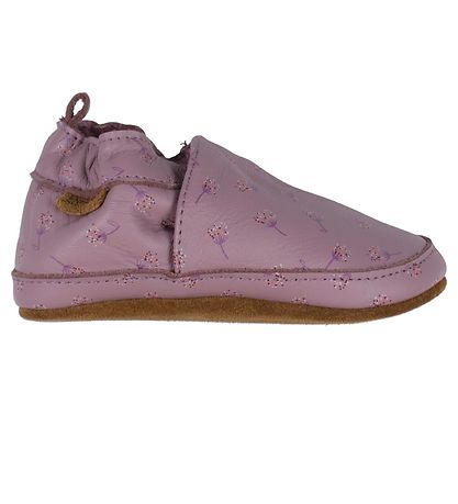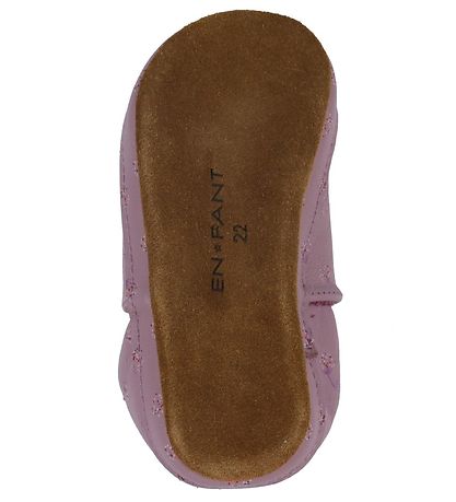 Beautiful En Fant soft soles in purple leather with small, purple flowers all over it.