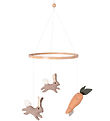 Beautiful Filibabba baby mobile with two runic rabbits and a carrot in linen.