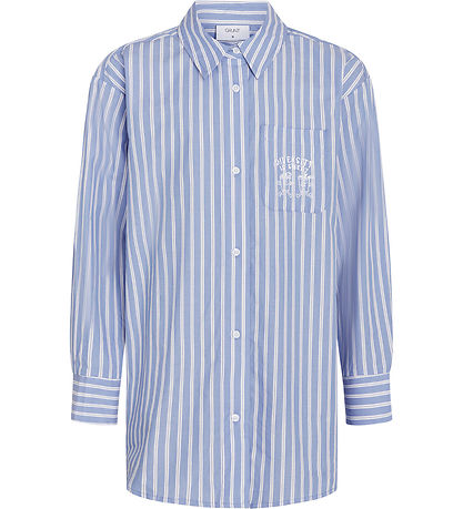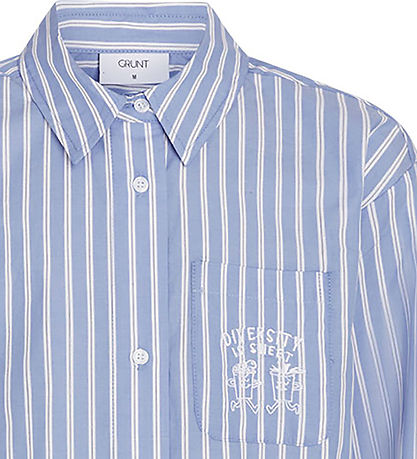 Frisk Grunt shirt in a light blue shade with stripes in white and black, and an embroidered text in white on the right chest pocket. The Shirt opens at the front with continuous buttons. The Shirt has long sleeves and a classic collar, which gives a modern look for any occasion.