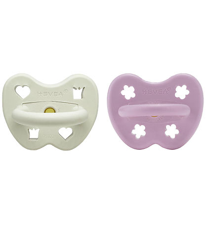 Fine Hevea pacifiers sold in a 2-Pack in light grey and purple, with decorative cutouts.