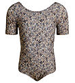 Beautiful Hummel gymsuit in a dark, blue-purple shade with a colorful floral pattern. The leotard has long sleeves and a round neckline.