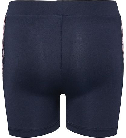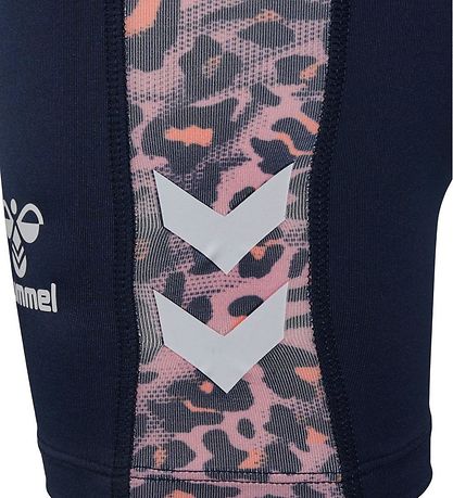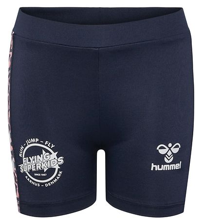 Smart Hummel shorts in navy with side in an all-over leopard print in pink and orange shades. On the right trouser leg there is a white print with "Flying Superkids" and "Run - Jump - Flight" standing, and on the left trouser leg there is a white logo print.
