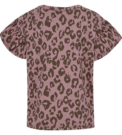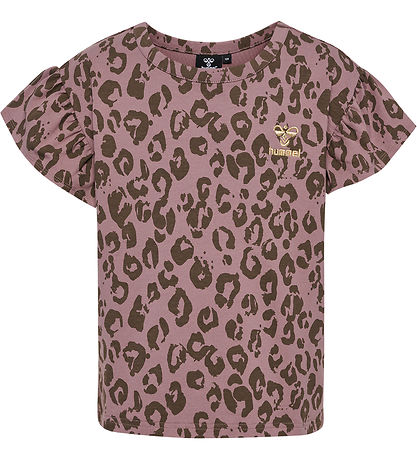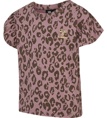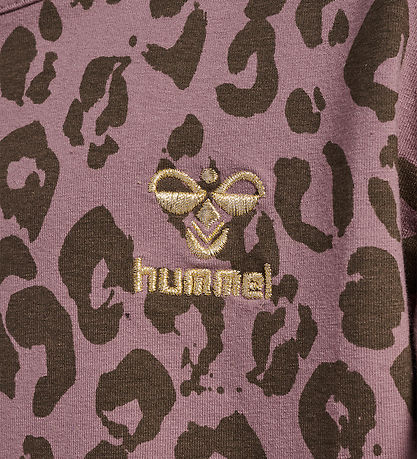 Beautiful Hummel t-shirt in purple shade with leopard print in army green shade. On the left chest there is a little print with the brand's name and logo in gold glitter.