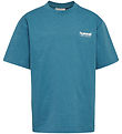 Beautiful Hummel t-shirt with short sleeves in a light beige shade, decorated with an eye-catching check print in dark blue. The T-shirt has a large logo print on the front, which gives a modern look.