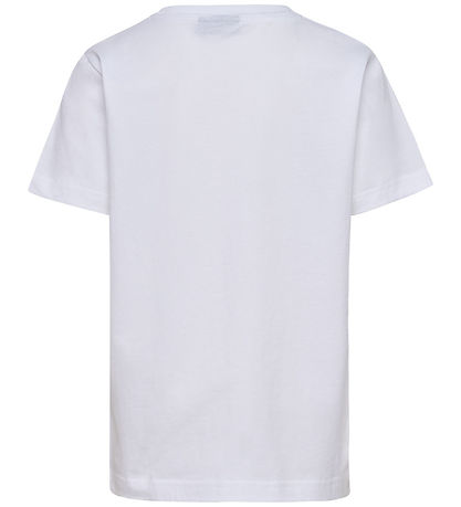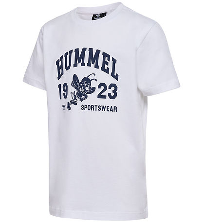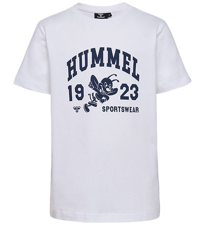 Nice Hummel t-shirt with short sleeves in white and a large, dark blue logo print on the front. The print shows the Hummel logo as well as the year "1923" and the text "SPORTSWEAR" in a classic sports style.