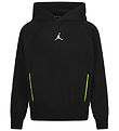 Smart Jordan hoodie in grey with a little, white logo on the chest. The Hoodie has a soft hood, which is closed with a Velcro closure. The Hoodie has a card zipper at the left shoulder with "Jordan" printed in white. There is a spacious kangaroo pocket on the front. There are wide ribbed edges at the sleeve and waist opening, and the inside is made of soft, brushed polyester.
