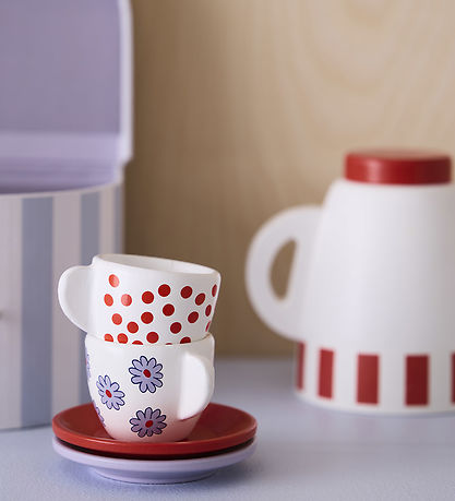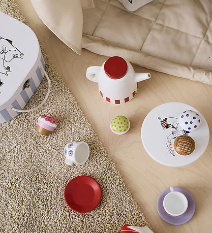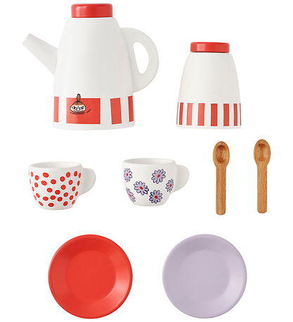 Beautiful Kids Concept coffee set made of white lacquered wood with red and purple details and a nice print with toy figurine from the Mumitroldene.