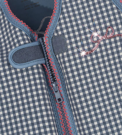 Beautiful Konges Sløjd swim vest with a check pattern in white and blue and with pink edges. On the back there is a large print with a bouquet of flowers and decorated with pink sequins.