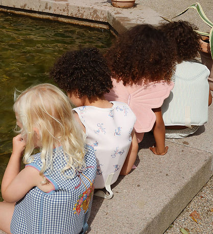 The Konges Sløjd swim vest has wide shoulder straps and opens at the front with a practical zipper, which can be hidden at the top behind a Velcro strap. At the bottom there is a strap from the back and across to the front, which can be adjusted in length and opens with a click buckle, which can be placed between the legs for extra security.