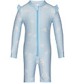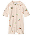 The Liewood swimsuit has medium-length sleeves and short legs and opens at the front with a zipper with an inner placket and chin guard. There is a wide edge at the neck opening and it is in a nice and stretchy quality.
