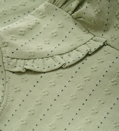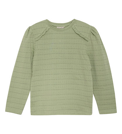 The Minymo blouse has long sleeves with a puff effect at the shoulders and a round neckline with a narrow ribbed edge. The Blouse has fine ruffles at the shoulders and it is made of a soft and stretchable quality.