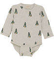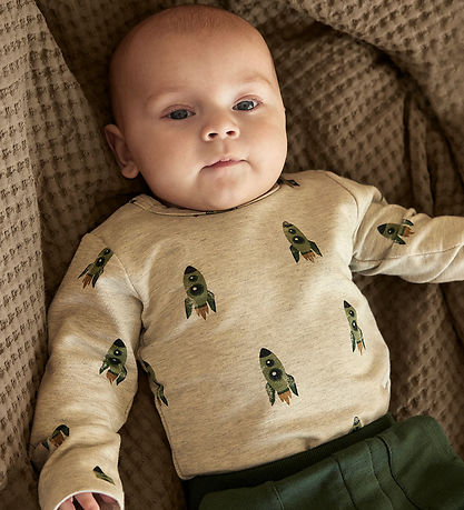Lovely Minymo bodysuit with long sleeves in a light grey colour with colorful rocket prints that create a playful atmosphere. The Minymo bodysuit is perfect for little adventurers and allows for Fri movement.