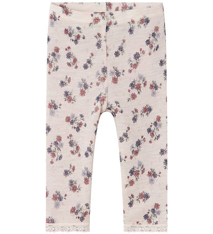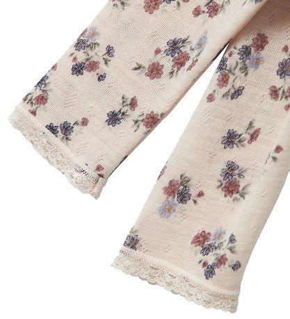Beautiful Name It leggings in melange pink with an all-over pointelle and a beautiful floral print in shades of blue, green and purple.