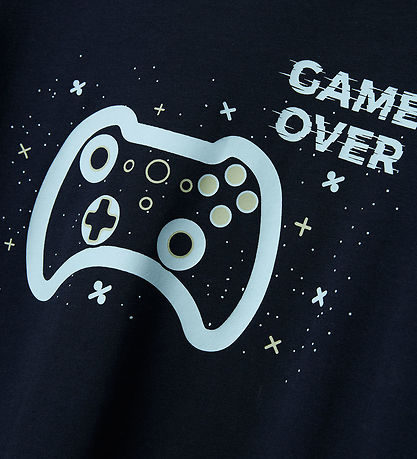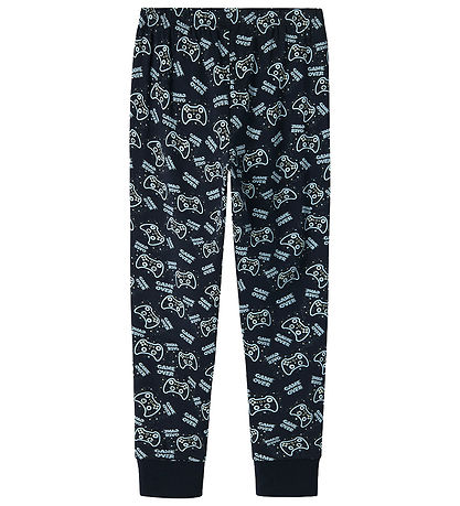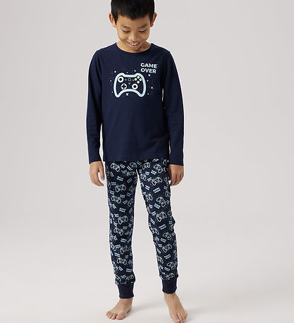 Fine Name It pyjama set, which is 2 Parts with a nightgown in navy blue with a gift print on the front and a pair of night trousers in navy blue with an all-over gamer print that ensures a good night.