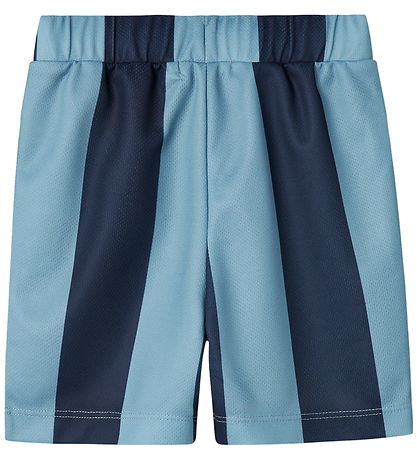 Smart Name It shorts with blue and light blue stripes and a print of Chase from Paw Patrol and the number "10" on the left leg. The Shorts have an elastic waist that can be adjusted with buttons inside. The Shorts are made of a lightweight polyester quality.