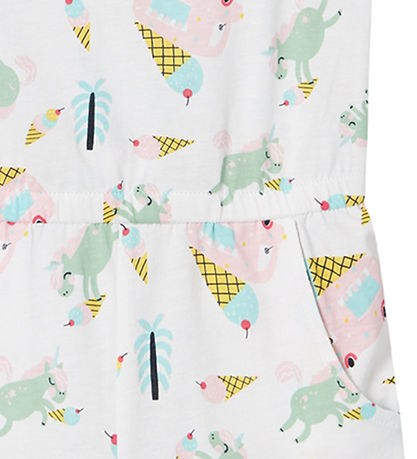 Cute Name It summer romper in white, with a fine allover print of unicorns and ice cream trucks in yellow, green and pink shades.