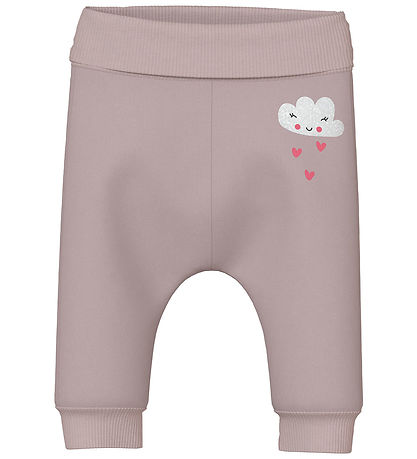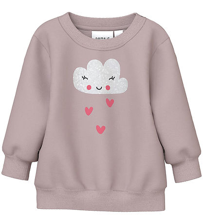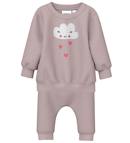 Charming Name It sweat set consisting of a sweatshirt and a pair of sweatpants in a soft vintage pink shade adorned with a cute skyprint with pink hearts on the front of the sweatshirt.