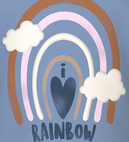 Beautiful Name It t-shirt in light blue with a print on the front of a rainbow in brown and pink shades, as well as white clouds with a cool 3D effect.