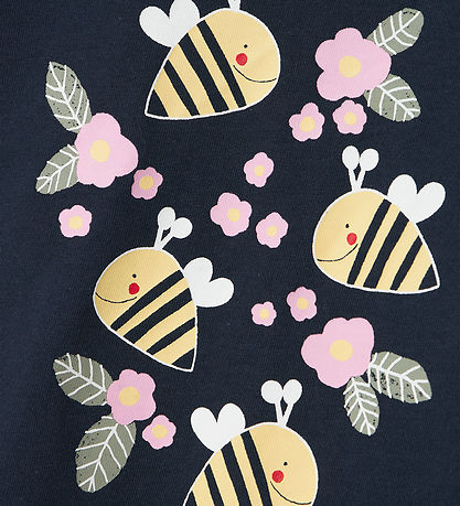 - Navy blue with a print on the belly of bees and flowers in pink, yellow and black