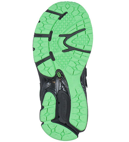The New Balance shoes are tightened over the instep with shoelaces. The shoes have a supportive heel cap, and inside there is green mesh and removable insoles. The shoes have black and green, lightweight outsoles with a practical tread pattern under the bottom, which ensures good footing.