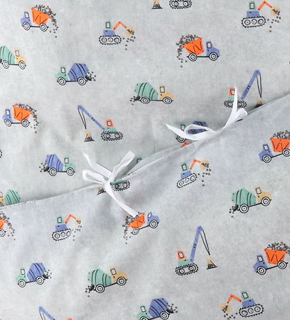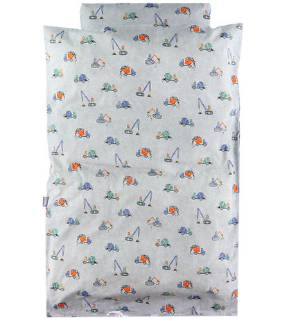 Fine Nørgaard Madsens bedding in concrete gray with an allover print of machines in blue, green, yellow and orange.