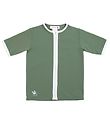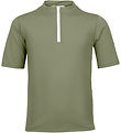 Smart Petit Crabe swim top in dusty green with a print of the text "Sun Kissed" on the front.