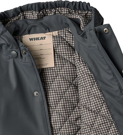 The Wheat rain jacket has elasticated edges at the wrists and two open pockets on each side, which close with a push-botton. The rain jacket's hood is removable and is Fast with push buttons on the collar. The Rain jacket has a blue check thermal lining, so the kid stays warm while being comfortable.