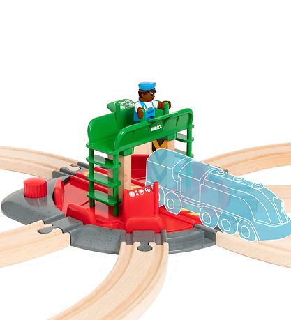 The BRIO roundabout has two parts, the roundabout itself and a train engineer figure with blue and white clothes.