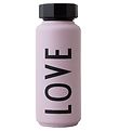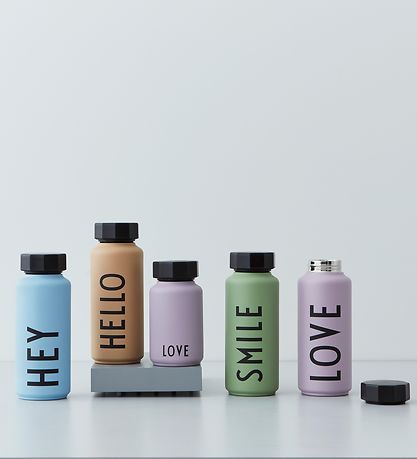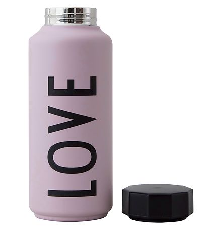 Fine Design Letters thermo bottle in matt lavender with black lid. At the bottom of the bottle, there is "LOVE" in black letters.