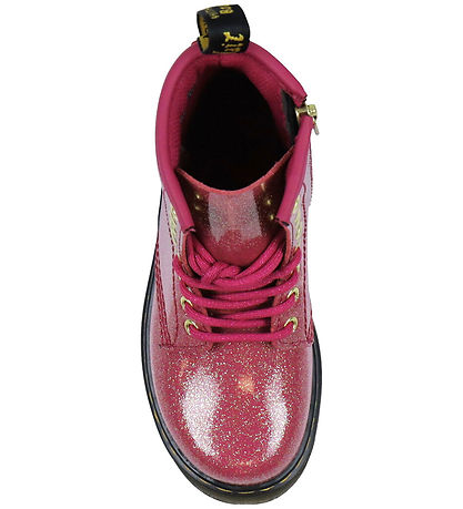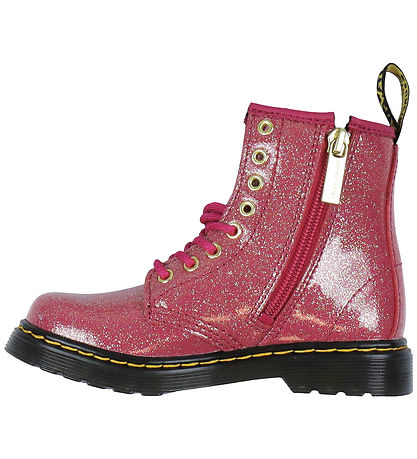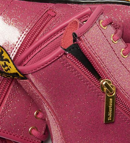 Cool Dr. Martens boots in pink patent leather with silver and gold glitter. The Boots have the classic yellow stitching around the outsoles.