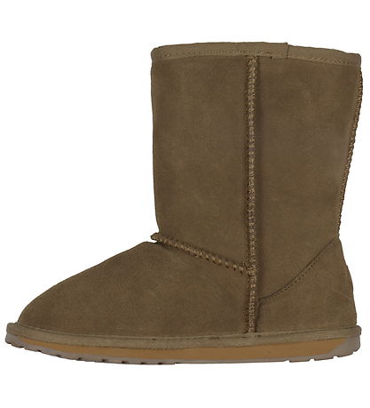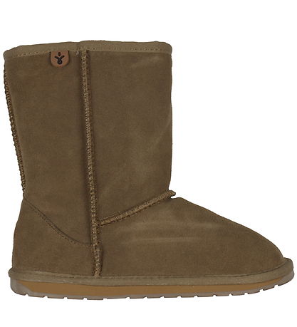 Lovely EMU Australia teddy boots in brown suede with smart exterior stitching. On the back there is a rubber label with the text "EMU Australia".