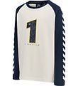 Beautiful Hummel blouse in white, and in front there is a 1- numbers in navy with a yellow edge and with a white print of various toy figurine from the movie "Space Jam: A New Legacy". The sleeves are navy with white shevrons.