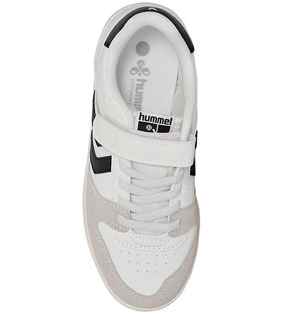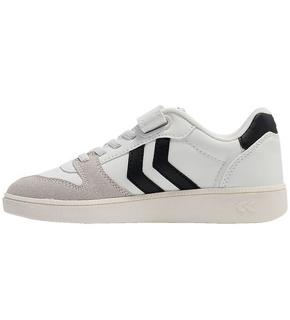 Stylish Hummel shoes in white imitation leather with a detail in light gray faux suede. The shoes have black logos on the sides and a black detail on the heel.