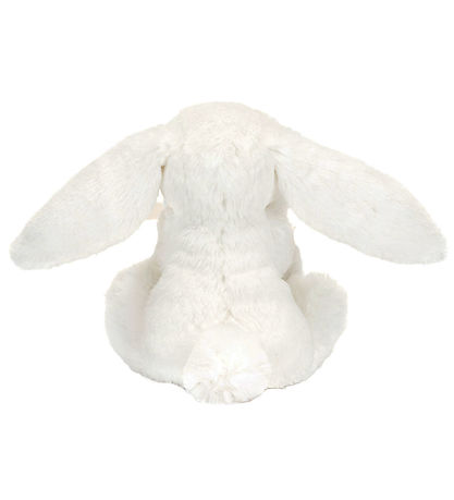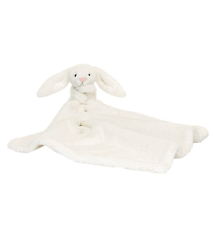 Cozy Baby Jellycat comfort blanket in white, with a little soft toy shaped like a rabbit with long ears sitting in one corner.