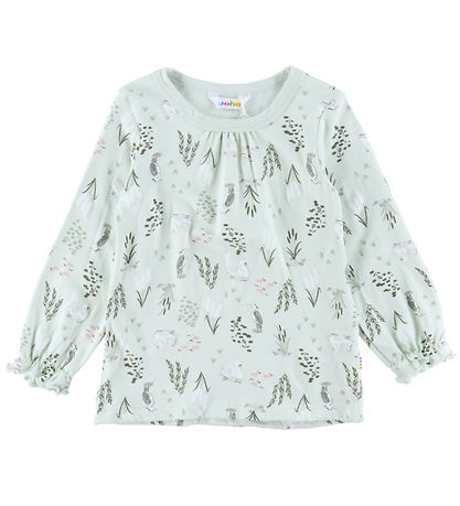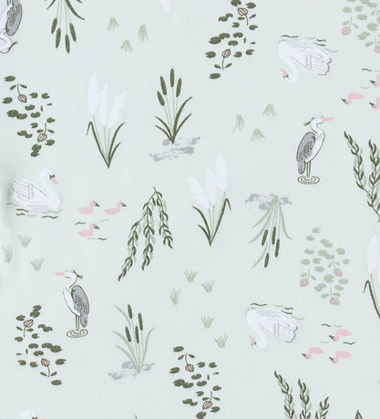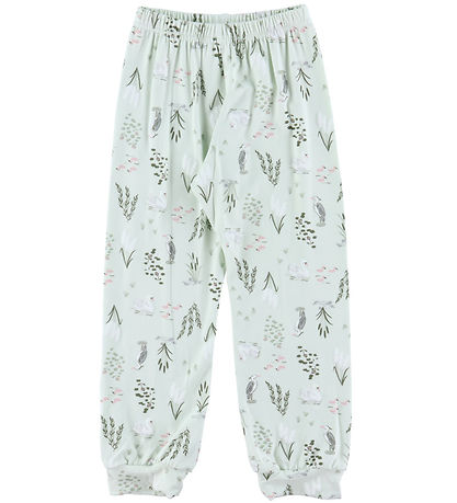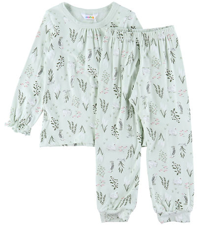 Fine Joha pyjama set consisting of a nightgown and a pair of night trousers in light green with an allover print of cute animals and plants in white, pink and green shades. The Joha nightgown has a round neckline with fine pleats at the front and long sleeves with a ruffled finish. The Night trousers have a narrow elastic at the waist and wide edges at the leg openings, which provide a good fit. The Pyjama set is made of a very soft quality that is comfortable to sleep in.