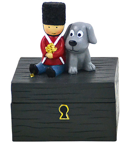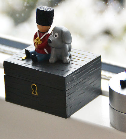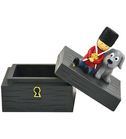 Beautiful Kids by Friis box with HC Andersen's fairy tale "Fyrtøjet" as the theme. The skin depicts a large, brown chest with a little soldier dressed in his guard uniform with a lot of gold coins in his hands and a large, grey dog on the lid.