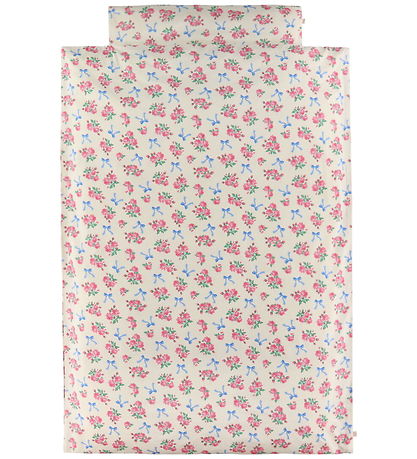 Cute Konges Sløjd bedding in off white with a print of blue bows and flowers in pink and blue. The Konges Sløjd bedding consists of a pillowcase with a fold-over closure, and a duvet cover that closes with a zipper at the end. The Bedding is made of soft, organic cotton, and comes in a smart storage bag.