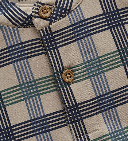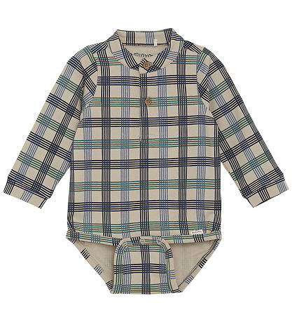 Elegant Minymo bodysuit with long sleeves in a classic check pattern that combines shades of blue, green and beige. The design is timeless and adds a stylish touch to any wardrobe. The Minymo bodysuit is equipped with a button closure at the front, which provides practical use. At the bottom, the bodysuit closes with three practical push buttons, which provides easy access when dressing and changing diapers.