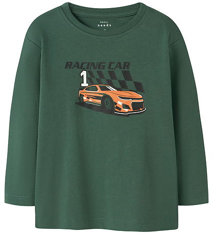 Smart Name It blouse in dark green with a print on the front of an orange race car and the text "Racing Car 1" in black and white. The Blouse has a round neckline with narrow ribbed edges and long sleeves.