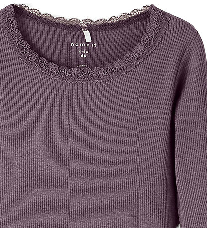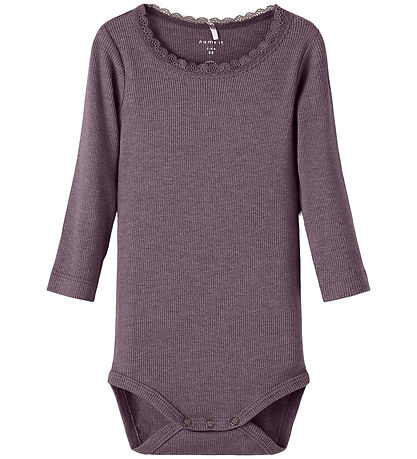 Beautiful Name It bodysuit in melange dusty purple with ribbed structure and a sweet decorative lace edge in the neckline.